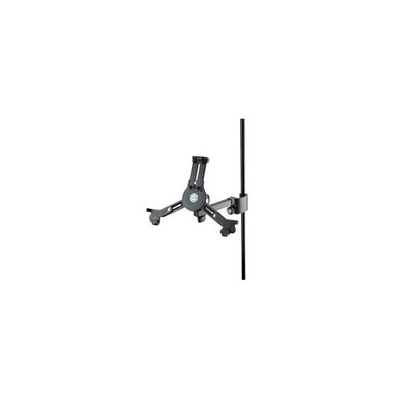 Soporte universal para tablet K&M se puede ajustar de forma variable para adaptarse a diferentes tamaños de tabletas sin necesidad de herramientas y mantiene los dispositivos de forma segura y eficaz para muchas situaciones diferentes, ya sea en el escenario, en salas de ensayo o en casa, gracias a su fuerte sistema de sujeción con la pinza ergonómica, el soporte se puede conectar a cualquier tubo de hasta 30 mm de diámetro de forma rápida y sencilla.