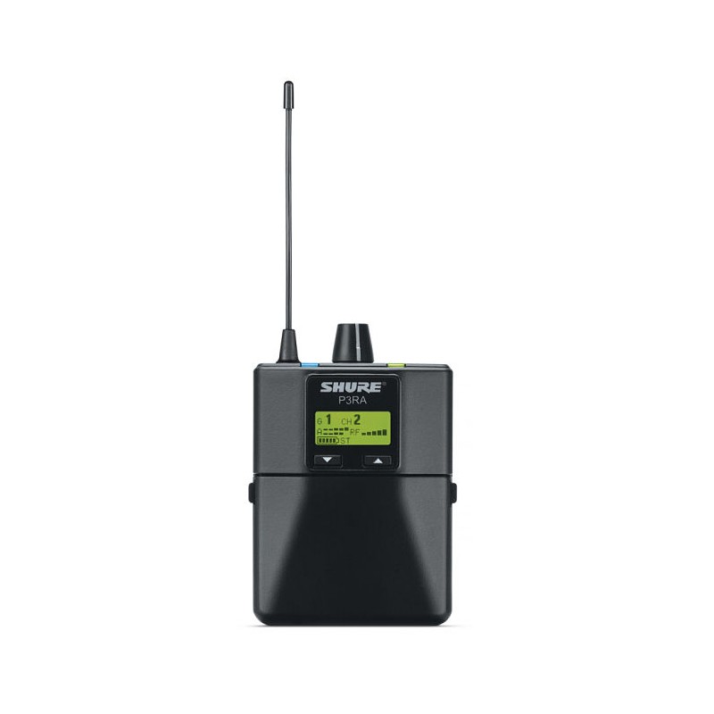 El receptor de cuerpo inalámbrico P3RA de Shure es un receptor inalámbrico estéreo compacto diseñado para ser utilizado con un transmisor Shure P3T.