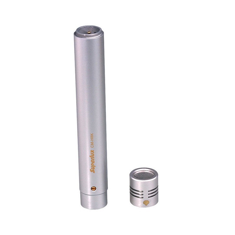 InstrumentoElectret supercardioide Serie CM-H8K son conjuntos de micrófono para la elección de los versátiles. Los patrones polares disponibles son cardioide, supercardioide y omnidireccional. El interruptor entre los patrones polares se puede lograr convenientemente por el cambio de cápsulas. Estafadores Una excelente Calidad electroacústica y Una pequena, exquisita forma, ESTA ES Serie Conveniente Para La Grabación Y microfonía instrumentos musicales, especialmente para los instrumentos musicales de las frecuencias medias y altas.Características: Amplia Respuesta de frecuencia, con la Elevación Específica en las Secciones medios y alta frecuencia, buena respuesta instantánea de alta sensibilidad, amplio rango dinámico,baja distorsión Contacto directo entre la cápsula y el cuerpo Tres cápsulas de polaridad diferentes disponibles Aplicación: grabación en directo vocal Cuerdas guitarra acústica piano latón Vientos percusiónSuperlux es un fabricante de taiwáns dedicado casi exclusivamente a productos relacionados con el mundo del audio, tanto a nivel doméstico como profesional