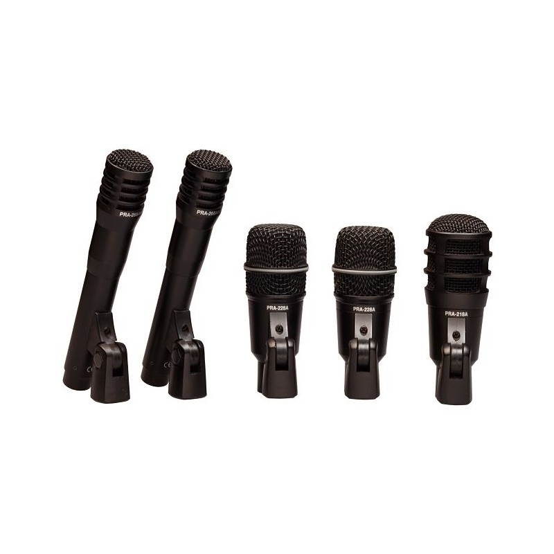 Set de 5 Microfonos Super Lux para Bateria con Clamps y Estuche Diseñado para la etapa en vivo y sala de ensayo. Simple, pero completa con un PRA-218A para bombo, 2 condensador de PRA-228A para el tom-tom, y 2 PRA-268A para platillos. Todos los micrófonos incluyen clip de micrófono