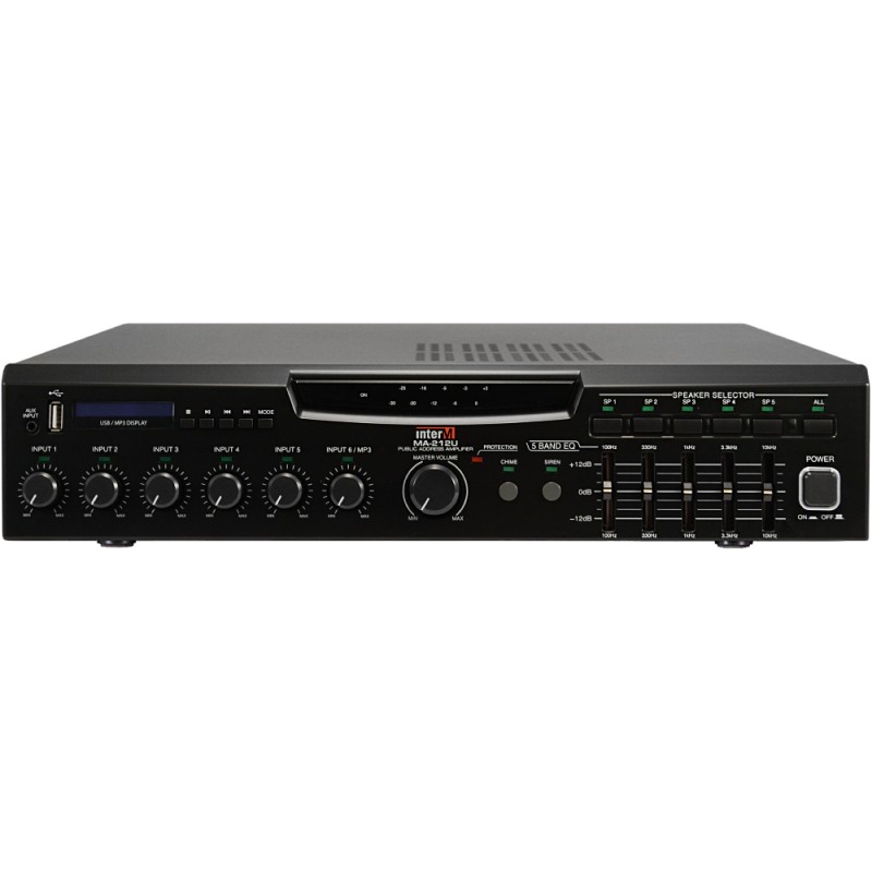 Amplificador mezclador de 120W con USB, 6 entradas de audio (3 entradas XLR y 2 entradas 1/4" con selector de mic/line, 1 entrada estéreo de linea RCA), 5 salidas, entrada telefonica, control VCA, conexión para mute y campanilla externa, salida de linea de 70V o 4Ω, incluye herrajes de rack BKT-A120.