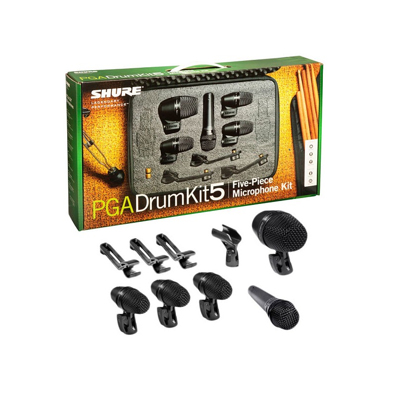 Incluye el micrófono para el bombo PGA52, 3 micrófonos para la batería PGA56, micrófono para los instrumentos PGA57, clip para el micrófono, 3 montajes para la batería, 5 cables XLR-XLR, estuche de transporte y guías para el usuario.