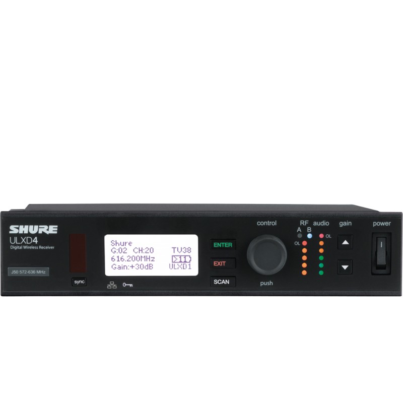 Receptor Inalámbrico Digital ULXD4Receptor inalámbrico digital que puede conectarse a la red con una codificación AES de 256 bits tiene una fuente de PS41US, antena de 1/2 onda y accesorios para rack.El ULXD4 de Shure es un receptor inalámbrico de medio rack, que puede conectarse a la red, para usarlo con los Sistemas Inalámbricos ULX-D®.El ULX-D ofrece un sistema inalámbrico optimizado de primer nivel para el refuerzo de sonido profesional, con un amplio conjunto de características profesionales, incluyendo una calidad de audio digital de 24 bits / 48 kHz, un desempeño de RF inteligente y una codificación AES de 256 bits.Nota: Al comprar componentes inalámbricos por separado, por favor de asegurar que las bandas de frecuencia coincida para garantizar un funcionamiento adecuado del sistema.