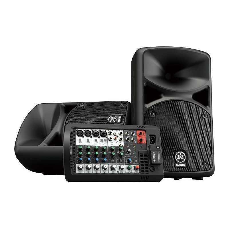 Sistema de Audio Yamaha Stagepas 400 Bluetooth Sistema de megafonía portátil de 400 watts con mezclador con alimentación de 8 canales Dos altavoces de 8 " Entrada Bluetooth®, reverberaciones digitales SPX, supresor de realimentación incorporado y ecualizador versátil. Salida de potencia de 400W (200W + 200W) Alta calidad de altavoces (LF: 8 "woofer / HF: 1" controlador de compresión de bobina de voz) Mezclador desmontable de 8 canales (4 líneas mono / línea + 4 mono / 2 estéreo) Transmisión de audio Bluetooth® 1-Knob Master EQ ™ con refuerzo virtual de graves Reverberaciones digitales SPX de alta resolución (4 tipos, control de parámetros) Supresor de realimentación a bordo Ecualizador de canal de 2 bandas de gran sonido Entradas estéreo / mono conmutables Entradas Hi-Z (alta impedancia) Poder phantom Salidas de monitor y subwoofer Pedal de reverberación opcional